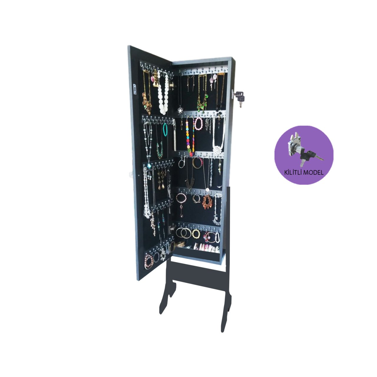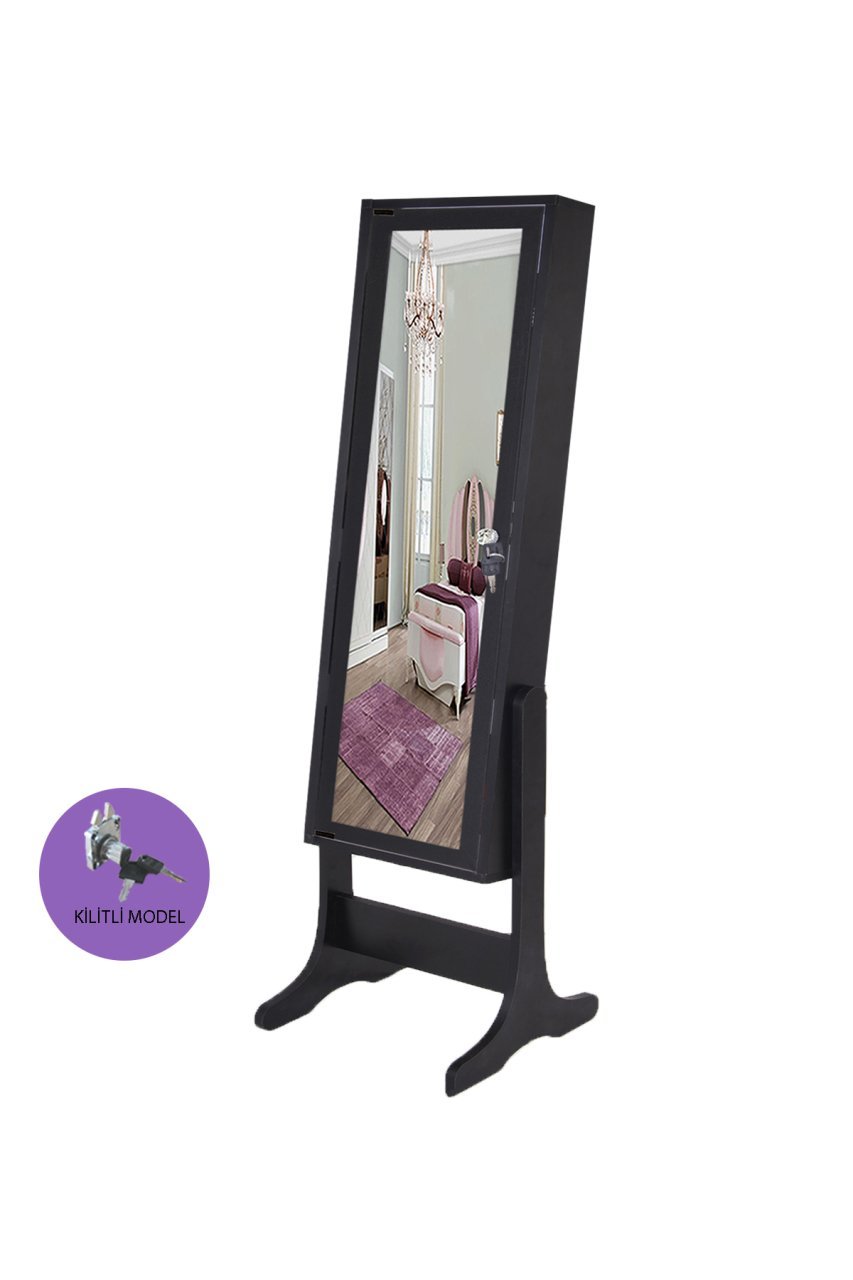 Takı Dolabı - İNCİ-Kilitli-Aynalı Takı Dolabı-SİYAH/SİYAH