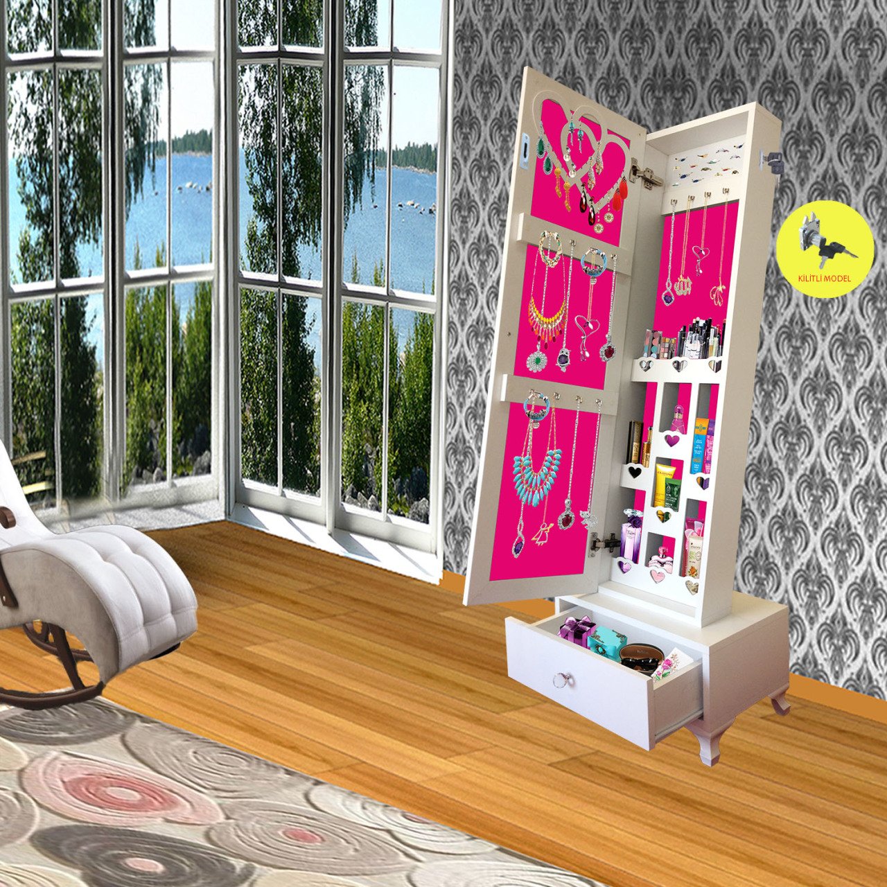 Takı dolabı şık ve kullanışlı hem makyajınızı tazeleyebilir hem de takılarınızı düzenleyebilirsiniz.