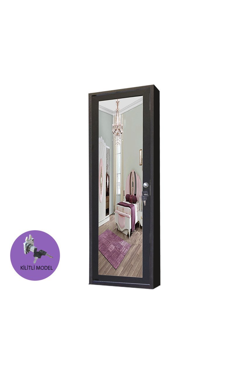 Takı Dolabı - Trendy- Kilitli - Duvara Asma - Aynalı Takı Dolabı - Siyah/Siyah
