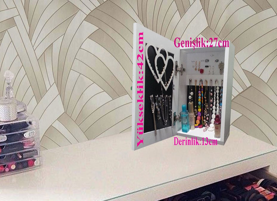 Takı dolabı şık ve kullanışlı hem makyajınızı tazeleyebilir hem de takılarınızı düzenleyebilirsiniz.